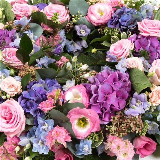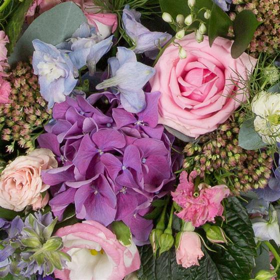 Larkpsur, hydrangeas, delphiniums, sedum, nigella, roses and lisianthus are included within this seasonal, summer bloom wreath.
